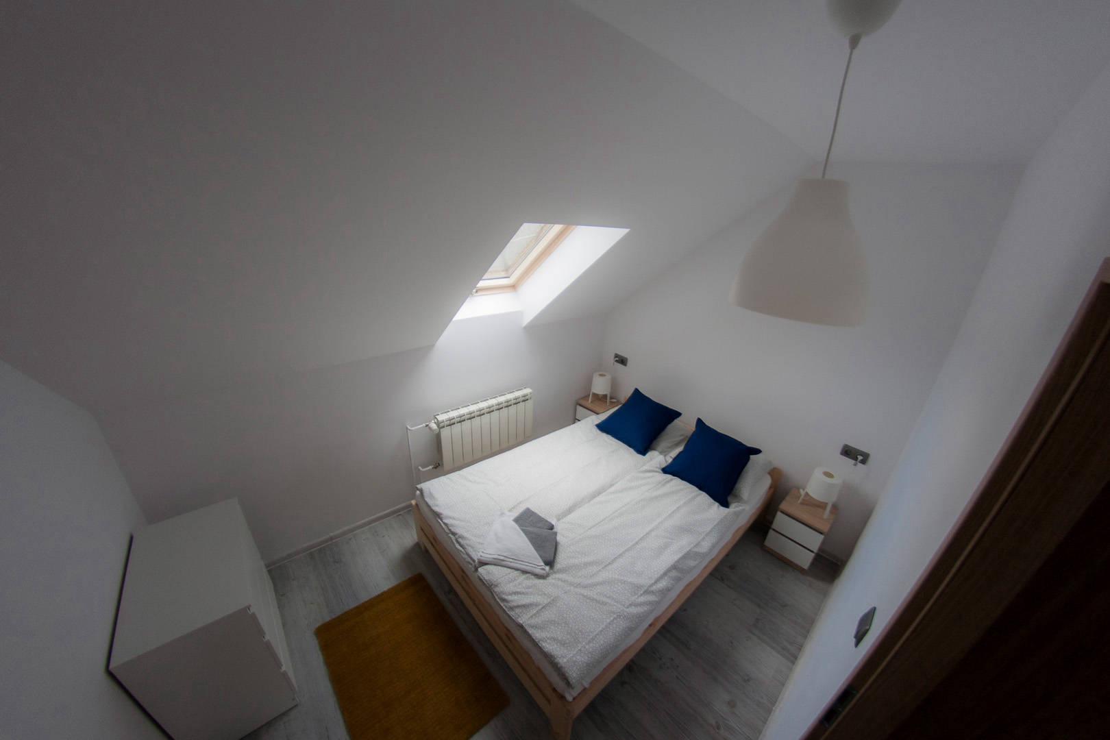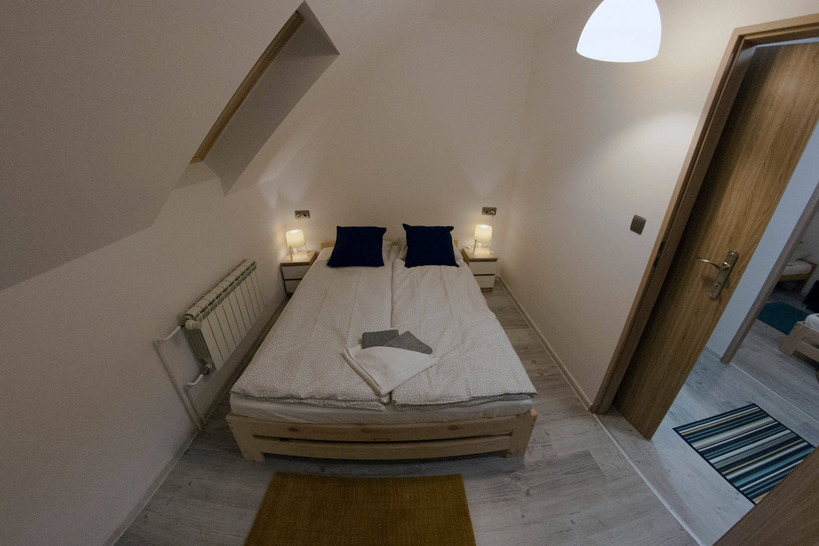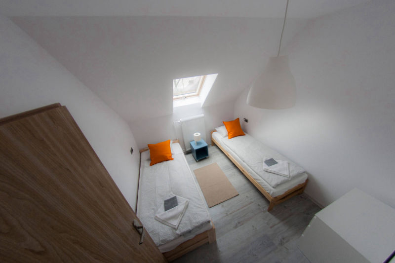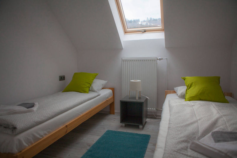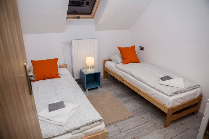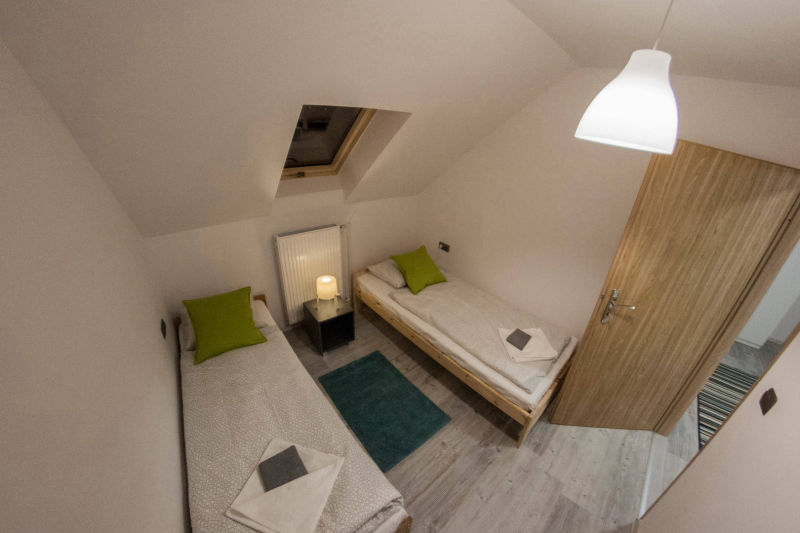 Na piętrze znajdują się trzy pokoje. Dwa – posiadają oddzielne łóżka, wspólną szafkę nocną oraz komodę. Jeden pokój wyposażony jest w podwójne łóżko (o wymiarach 140x200), komodę oraz dwie szafki nocne po bokach. Na piętrze znajduje się również toaleta z umywalką i szafką. Na korytarzu usytuowana jest pojemna szafa.