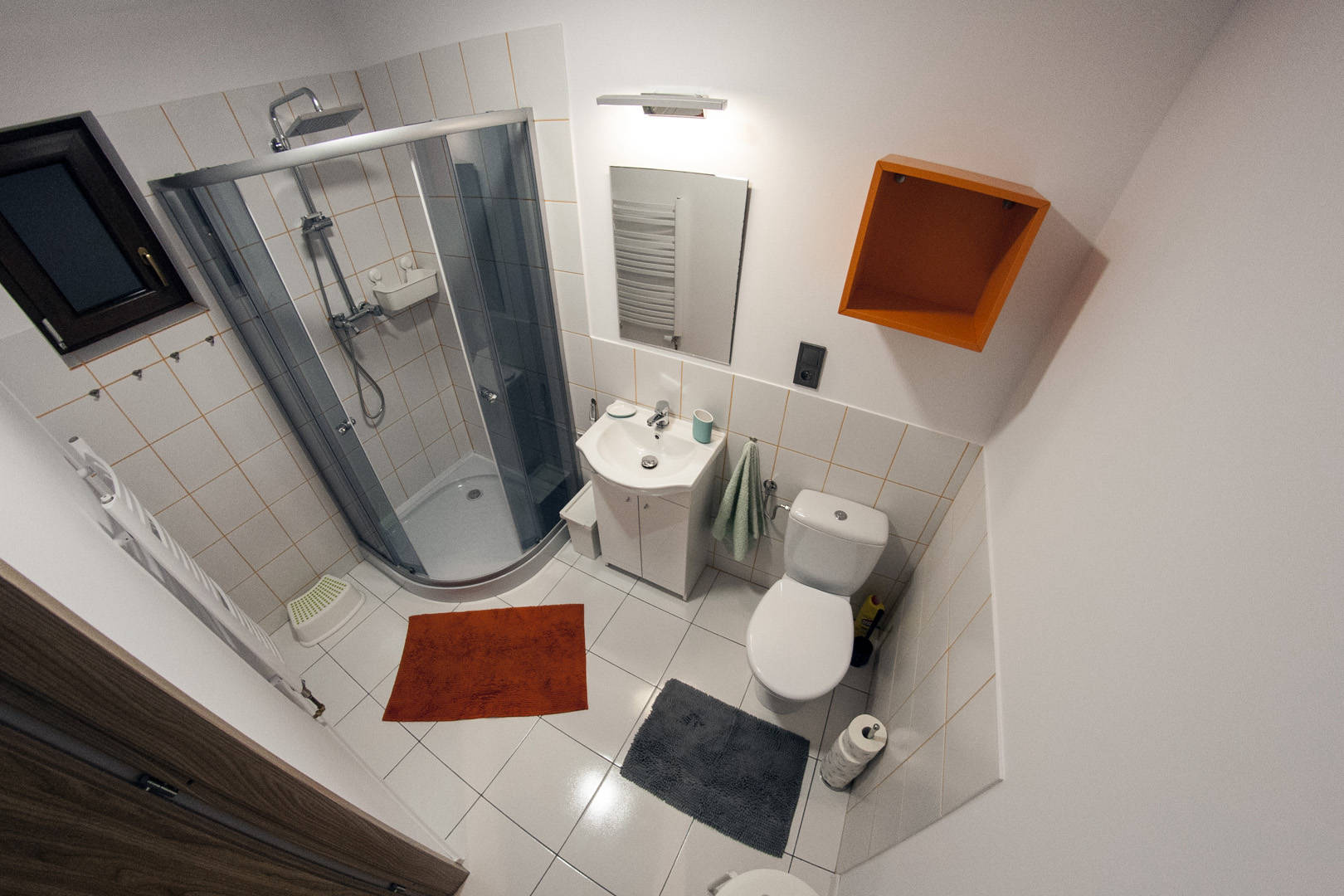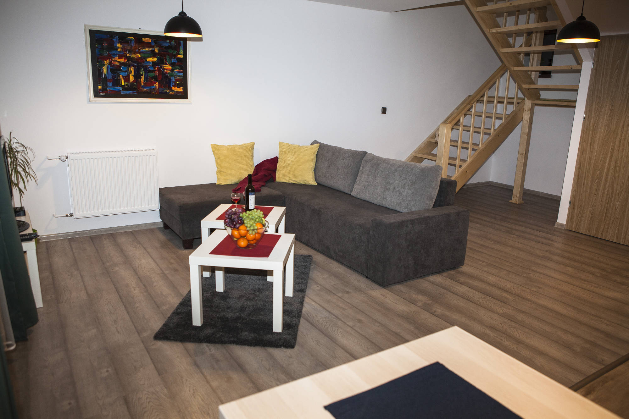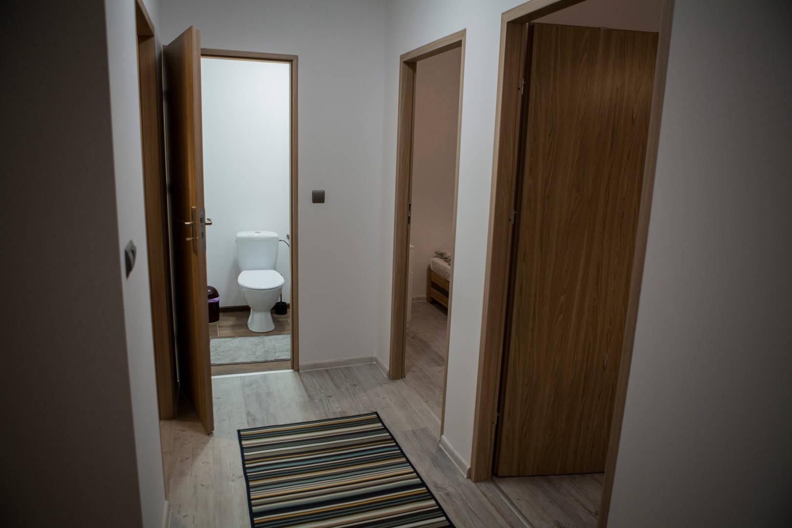 Na piętrze znajdują się trzy pokoje. Dwa – posiadają oddzielne łóżka, wspólną szafkę nocną oraz komodę. Jeden pokój wyposażony jest w podwójne łóżko (o wymiarach 140x200), komodę oraz dwie szafki nocne po bokach. Na piętrze znajduje się również toaleta z umywalką i szafką. Na korytarzu usytuowana jest pojemna szafa.